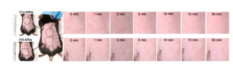 可測試微針刺入皮膚的驗(yàn)證,對刺入深度和溶解進(jìn)行偵察和勘探,并記錄溶解曲線、釋放曲線、皮膚修復(fù)的時(shí)間及過程及測試微針刺入皮膚后的溶解情況。