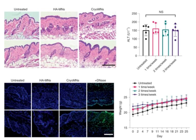 2. 通過H&E 染色、 TUNEL 染色、 ALT、體重等的測定,對微針的生物相容性及安全性進(jìn)行評價(jià)。