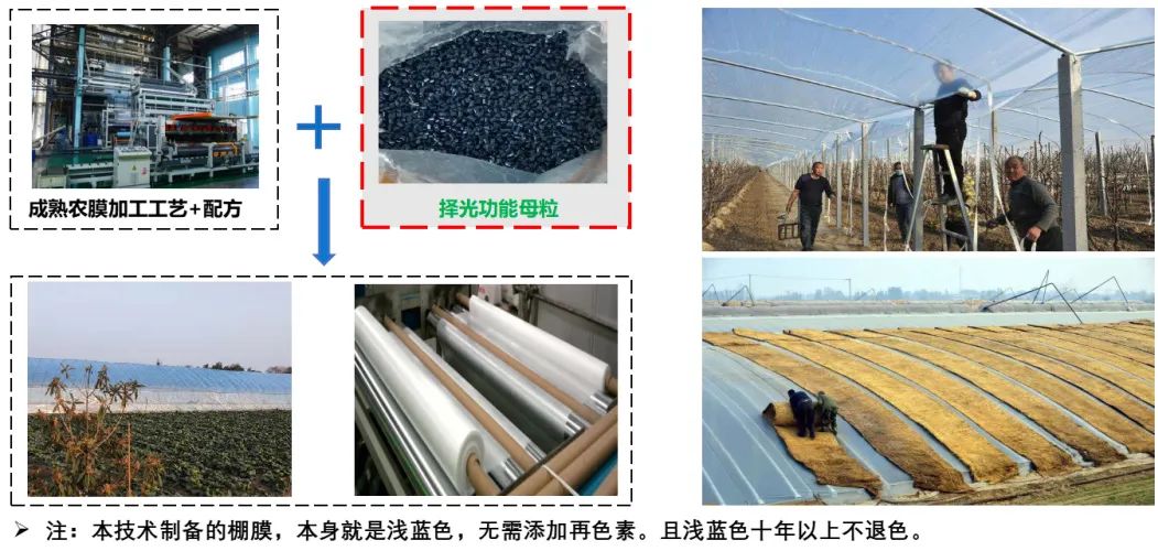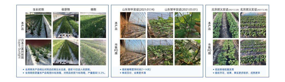 本團(tuán)隊(duì)已形成 “功能粉體→漿料→母?!∧ぁ钡娜准夹g(shù),可依據(jù)不同種植區(qū)氣候、作物等環(huán)境進(jìn)行產(chǎn)品設(shè)計(jì),實(shí)現(xiàn)因地制宜的產(chǎn)品選型。目前,本技術(shù)已通過日本評(píng)價(jià)認(rèn)證,具有可減少蔬菜生長(zhǎng)周期(>10天)、增產(chǎn)(>13%)、草莓甜度提高3%等顯著效果,有望助力我國(guó)農(nóng)膜現(xiàn)代化,引領(lǐng)國(guó)際同類產(chǎn)品新潮流。