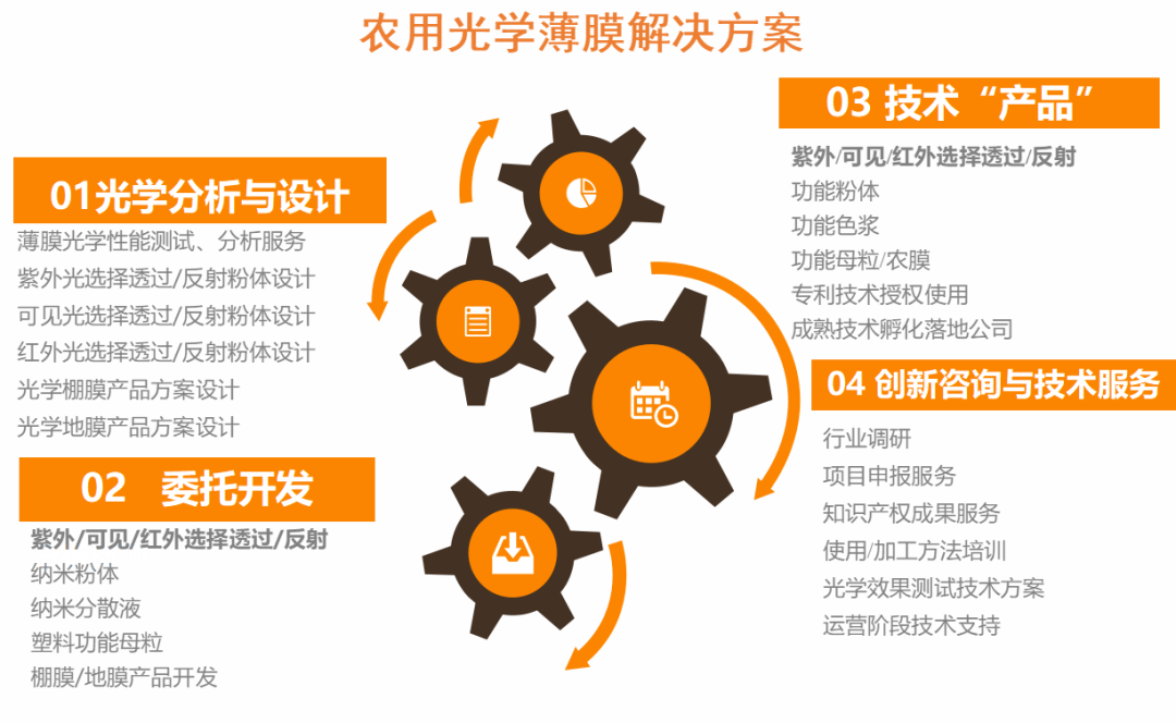 可基于不同季節(jié)、地域、農(nóng)作物生長(zhǎng)對(duì)光線不同的需求,以光熱分控型納米復(fù)合材料技術(shù)及硬件平臺(tái)為支撐,通過光學(xué)分析與設(shè)計(jì)、功能陶瓷粉體/分散液/母粒開發(fā),快捷應(yīng)用與現(xiàn)有農(nóng)膜加工工藝和配方中,實(shí)現(xiàn)“光調(diào)控”農(nóng)膜的快速定制開發(fā),服務(wù)于高科技農(nóng)膜產(chǎn)品快速升級(jí)迭代通過高新技術(shù)的引入,助力農(nóng)業(yè)發(fā)展新高地,推進(jìn)農(nóng)業(yè)科技創(chuàng)新,最終實(shí)現(xiàn)增產(chǎn)增收,使得農(nóng)民富起來;不忘記農(nóng)民,改善農(nóng)民勞作環(huán)境!