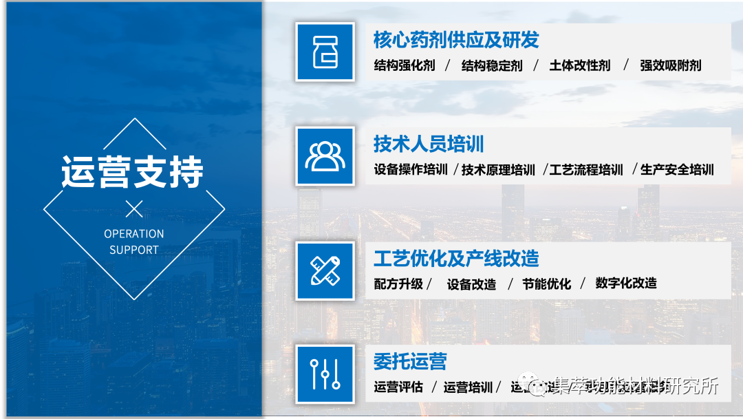 本服務(wù)階段為客戶提供全方位項(xiàng)目運(yùn)營(yíng)支持服務(wù),包括核心藥劑穩(wěn)定供應(yīng)和持續(xù)研發(fā)迭代、技術(shù)人員培訓(xùn)、設(shè)備工藝優(yōu)化、產(chǎn)線升級(jí)改造和委托運(yùn)營(yíng)服務(wù)等,以保障項(xiàng)目長(zhǎng)久穩(wěn)定運(yùn)行。