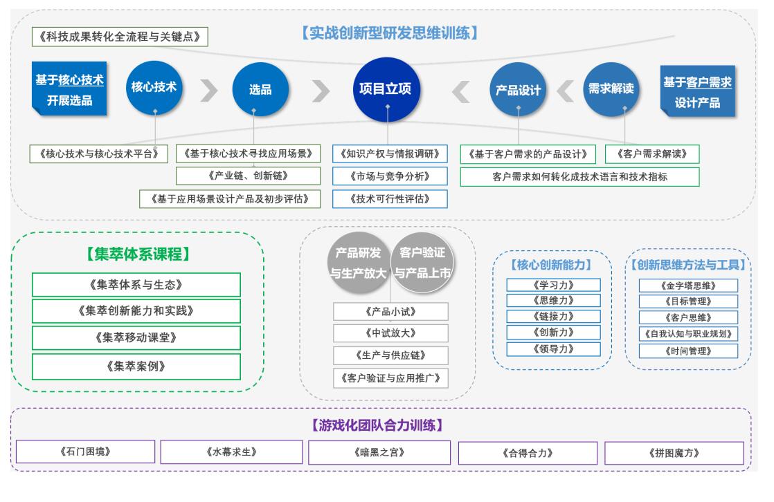 本次集萃創(chuàng)新創(chuàng)業(yè)特訓營課程體系重點培育學生的創(chuàng)新型思維,將通過研發(fā)方法論的講授、思維能力的培養(yǎng)以及實踐性的訓練,對學員進行企業(yè)“研發(fā)工程師”和“產品經理”的底層思維訓練;同時打造沉浸式課程體驗,以圍繞江蘇產業(yè)培養(yǎng)一批未來的企業(yè)創(chuàng)新型研發(fā)總監(jiān)和師生共創(chuàng)科技企業(yè)合伙人為目標,探索基于實踐導向、需求導向,并充分體現(xiàn)產教融合、科教融合的具有集萃鮮明特色的高層次產業(yè)創(chuàng)新人才培養(yǎng)課程體系。