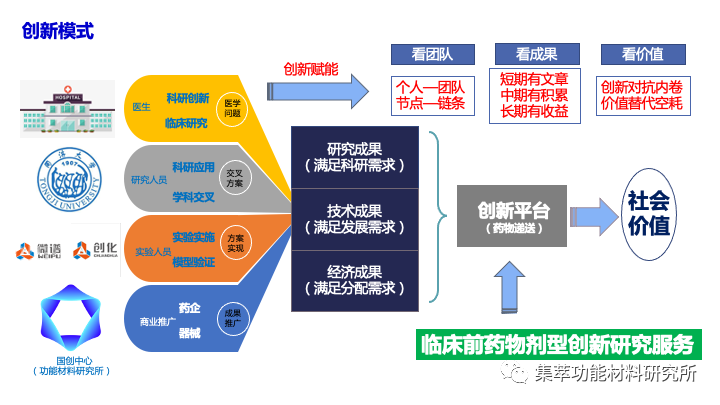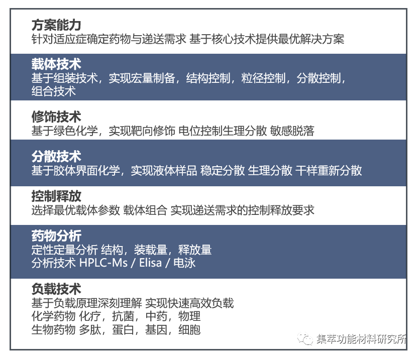 功能材料所臨床前藥物遞送(制劑)創(chuàng)新方案平臺基于解決問題、創(chuàng)造價值為導(dǎo)向;積聚納米載體、生物水凝膠、微針、熒光探針等制劑領(lǐng)域的資深專家教授團(tuán)隊;搭建集研究、設(shè)計、開發(fā)、項(xiàng)目支持為一體的全流程創(chuàng)新平臺;以引導(dǎo)創(chuàng)新發(fā)生,助力創(chuàng)新轉(zhuǎn)化為使命,提供專業(yè)、高效的藥物遞送制劑創(chuàng)新解決方案。