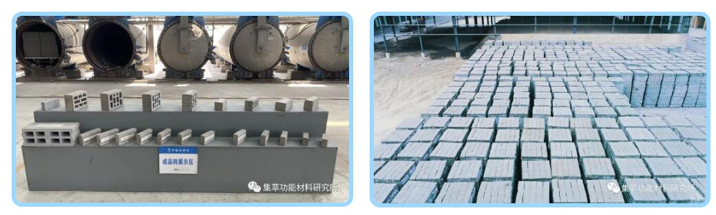 在此研究基礎上,集萃功能材料所聯(lián)合同濟大學蔣正武教授團隊開展深度合作,對固廢礦化核心技術進行了成果轉化和中試驗證,開發(fā)出純固廢捕集礦化二氧化碳制備負碳建材的工業(yè)化工藝路線與相應成套裝備,形成了全流程整體解決方案。目前本方案可實現(xiàn)高礦化活性固廢(電石渣、鋼渣、磷渣、錳渣等)與低礦化活性固廢(粉煤灰、氣化渣、鑄造砂、建筑垃圾等)的協(xié)同處置,實現(xiàn)不同溫度、壓力、濃度條件下工業(yè)煙氣CO2的礦化利用,形成墻體材料、再生骨料、市政道路材料、生態(tài)護坡?lián)鯄Φ认盗懈吒郊又诞a(chǎn)品,廣泛應用于市政、建筑、水利等領域,實現(xiàn)了廉價廢料到高值產(chǎn)品的價值跨越,真正達成了固廢資源化產(chǎn)品從原料端到應用端的全生命周期低碳減排。