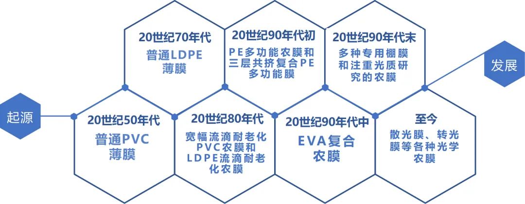 棚膜覆蓋栽培技術早在20世紀50年代末就已經開始應用,該技術不僅能促進作物生長,使作物增產,而且實現了果蔬在寒冷季節(jié)的栽培。我國溫室大棚的發(fā)展相對較晚,從上世紀60年代才開始有了簡易的塑料大棚,80年代后溫室大棚進入爆發(fā)期。目前,國內外的農膜創(chuàng)新研發(fā)均著重朝向“光功能化”發(fā)力!
