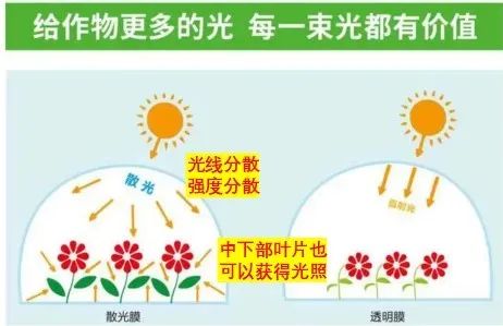 通過在棚膜基體樹脂中添加散光劑達到散光目的,使透過棚膜的光線在棚膜的內部或表面發(fā)生漫反射作用,使得棚內作物受光更均勻,減少夏日局部高溫的光合作用效率更高,著色更好,成熟時間更早;且陽光強烈時,可有效降低棚內溫度,防止作物灼傷。