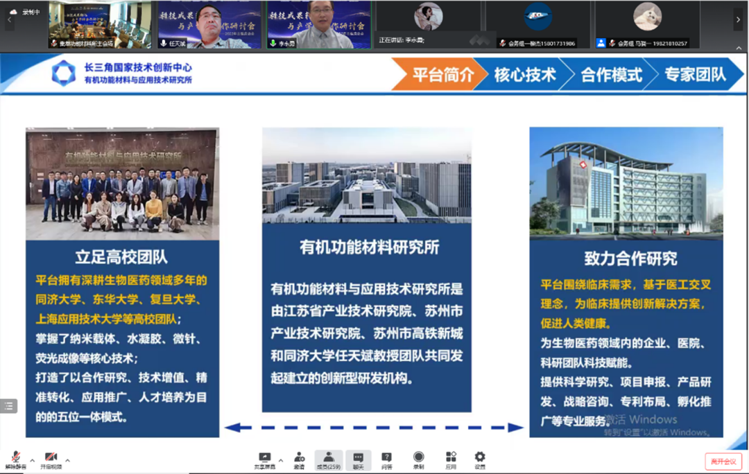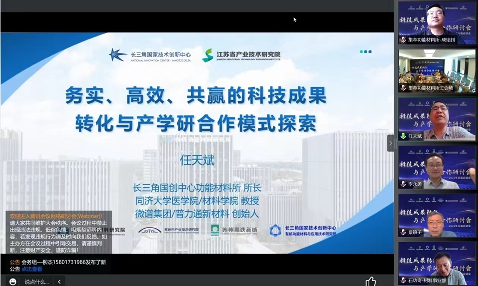 創(chuàng)中心有機(jī)功能材料與應(yīng)用技術(shù)研究所聯(lián)合主辦的“科技成果轉(zhuǎn)化與產(chǎn)學(xué)研合作研討會(huì)——2022云端啟動(dòng)會(huì)”成功舉辦,會(huì)議專家云集、群英薈萃,參會(huì)嘉賓代表有來(lái)自科研院所、政府部門(mén)、產(chǎn)業(yè)鏈各相關(guān)企業(yè)和平臺(tái)的領(lǐng)導(dǎo)、專家,以及長(zhǎng)三角國(guó)創(chuàng)中心及下屬各事業(yè)部領(lǐng)導(dǎo)及項(xiàng)目經(jīng)理、部分研究所負(fù)責(zé)人及聯(lián)創(chuàng)中心負(fù)責(zé)人,功能材料所各平臺(tái)負(fù)責(zé)人。