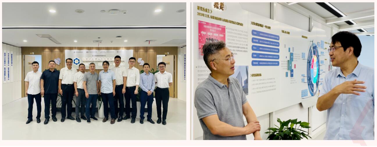 2022年7月13日,江蘇凱倫建材股份有限公司(以下簡稱“凱倫建材”)總裁李忠人、研發(fā)中心總監(jiān)單永勝及研發(fā)部主要負責人一行蒞臨長三角國家技術(shù)創(chuàng)新中心有機功能材料與應用技術(shù)研究所(以下簡稱“功能材料所”)參觀指導,所長任天斌、副所長王勇及各平臺主任陪同接待。