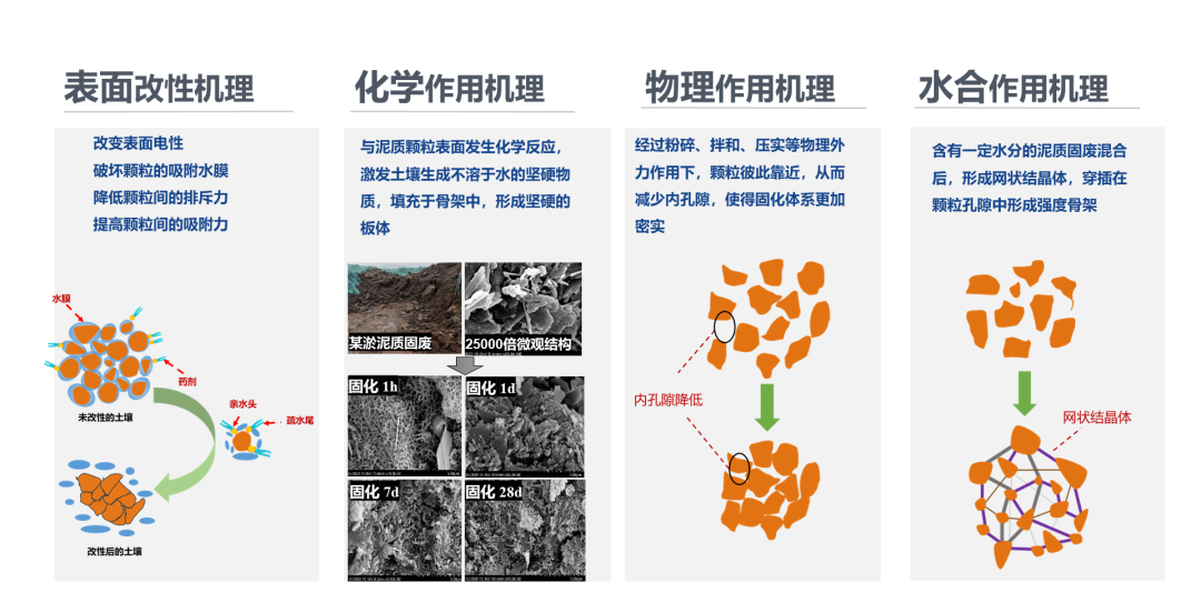 在關(guān)鍵藥劑方面,環(huán)保中心自主研發(fā)出了萃路克復(fù)合穩(wěn)定劑(TriRock,寓意:三倍石頭強(qiáng)度),可以應(yīng)用于不同場景下的不同理化性質(zhì)固廢。該藥劑通過表面改性、化學(xué)作用、物理作用、水合作用等多種作用耦合,破壞固廢顆粒的吸附水膜,使其從親水性變?yōu)槭杷?,并形成不溶于水的?jiān)硬物質(zhì)和網(wǎng)狀結(jié)晶體,填充在骨架中,在施工過程中經(jīng)過粉碎、拌合、平整、壓實(shí)等物理外力下,使得固化體系更加密實(shí),具有高強(qiáng)的路用性能,同時(shí)可對各類污染物進(jìn)行高效固定,實(shí)現(xiàn)固廢安全穩(wěn)定應(yīng)用。