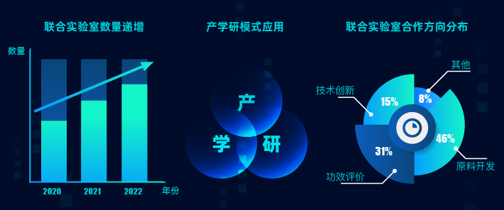據(jù)統(tǒng)計(jì),聯(lián)合實(shí)驗(yàn)室大多采用產(chǎn)學(xué)研模式,合作方向中,以原料開發(fā)為主,約占46%,功效評價(jià)占比三成。