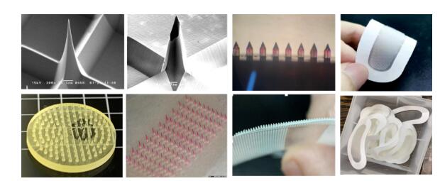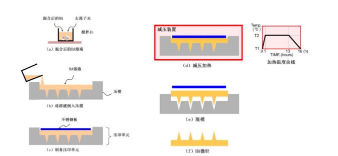 以HA微針制備工藝流程為例,通過(guò)將 HA 和去離子水混合來(lái)制備 HA 溶液。完成圖 a 所示的過(guò)程后,所形成的 HA 溶液的范圍從稀釋溶液到高粘度溶液,具體取決于 HA 各種分子量的配比比列。制備 HA 溶液后,將其倒入壓模中,如圖 b 所示。然后,將不銹鋼板(0.5mm×12mm×12mm,0.562g)放置在溶液上,如圖 c 所示。該結(jié)構(gòu)在圖中稱(chēng)為壓印單元。然后,將夾在不銹鋼板和壓模之間的溶液在減壓裝置中于 130°C的溫度放置一天,如圖 d 所示。溫度曲線(xiàn)如下;T1 和 T2分別表示室溫、溶液在減壓裝置中蒸發(fā)的合適溫度。在此,T1 和 T2 設(shè)置為 25℃和 130℃。在 1 小時(shí)內(nèi),溫度從T1升高到 T2。溫度在 T2上保持 24 小時(shí),然后將溫度降低到 40℃后,將微針從減壓裝置中取出,并從壓模中取出微針,如圖 e 所示。冷卻至室溫后,可以獲得圖 f 的 HA 微針。